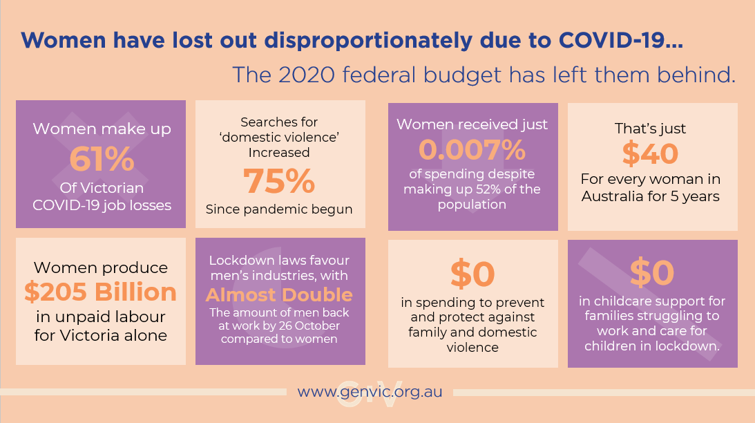 In the lead up to Budget 2020-21, there were many constructive calls for a gender responsive budget with Covid19 worsening gender inequality. Over 100 organisations committed to gender equity and women across Victoria made a joint statement calling for State and Federal Governments to recognise the gendered impacts of COVID-19.